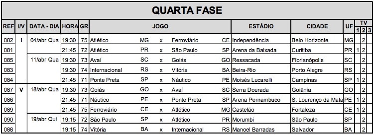 Ao todo, dez times disputam a quarta fase do torneio nacional. Como entre as equipes há aquelas que estão na Copa Sul-Americana foram definidas duas datas para os confrontos de ida (dias 4 e 11 de abril) e outras duas para as partidas de volta (dias 18 e 19 do mesmo mês).